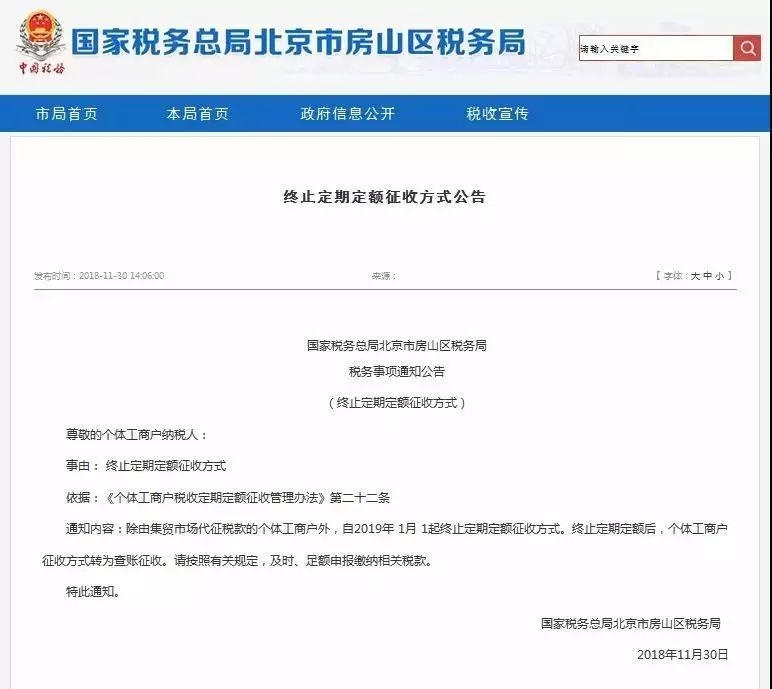 紧急消息,个体工商户的注意了,国家税务总局北京市海定区税务局刚刚通知:自2019年 1月 1起终止定期定额征收方式,个体工商户征收方式转为查账征收,请及时、足额申报缴纳相关税款。事关重大,请大家一一仔细阅读。