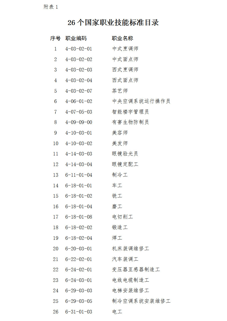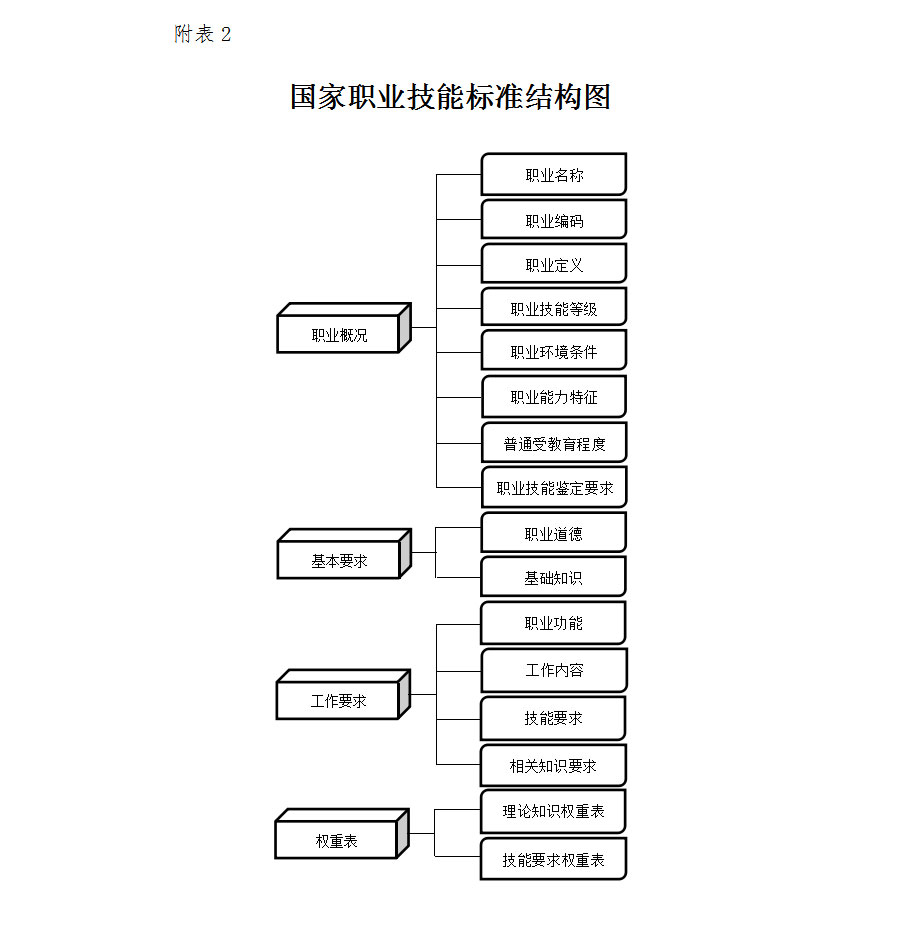 日前,人社部办公厅颁布中式烹调师等26个国家职业技能标准(见附表1)。国家职业技能标准是在职业分类的基础上,根据职业活动内容,对从业人员的理论知识和技能要求提出的综合性水平规定。它是开展职业教育培训和人才技能鉴定评价的基本依据(国家职业技能标准结构图见附表2)。