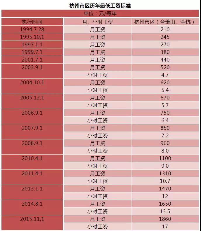 杭州市区(不含临安区)从2017年12月1日起, 最低月工资标准调整为2010元,非全日制工作的最低小时工资标准调整为18.4元。