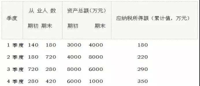 甲企业2017年成立,从事国家非限制和禁止行业,2019年1-4季度的资产总额、从业人数以及累计应纳税所得额情况如下表所示: