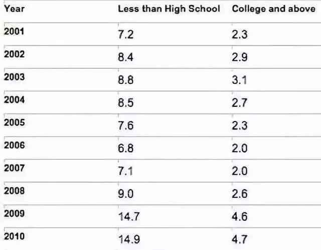 美国失业率和受教育程度的关系,从左到右分别为:年份、本科以下,本科及以上。