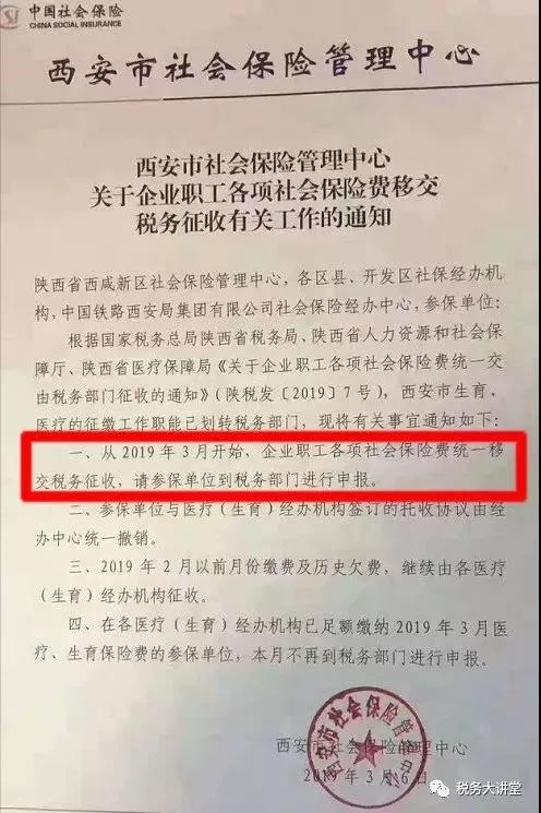 3月6日,一份《西安市社会保险管理中心 关于企业职工各项社会保险费移交税务征收有关工作的通知》流出,显示:2019年3月起,企业职工各项社会保险费统一移交税务征收,参保单位需到税务部门进行申报!