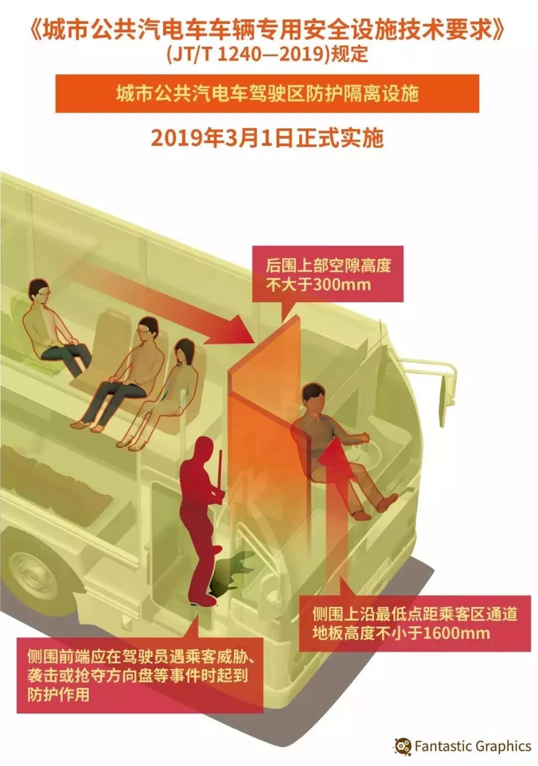 《城市公共汽电车车辆专用安全设施技术要求》3月1日正式实施。其中具体规定了城市公共汽电车驾驶区防护隔离设施的技术要求,防护隔离设施后围上部空隙高度不大于300mm,侧围上沿最低点距乘客区通道地板高度不小于1600mm。要求应有效防止乘客与驾驶员直接肢体接触,防止乘客抢夺方向盘。