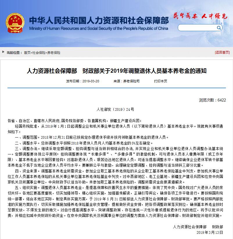 人社部网站20日上午发布《人力资源社会保障部 财政部关于2019年调整退休人员基本养老金的通知》(下称《通知》),其中明确,从2019年1月1日起调整企业和机关事业单位退休人员基本养老金水平,总体调整水平按照2018年退休人员月人均基本养老金的5%左右确定。