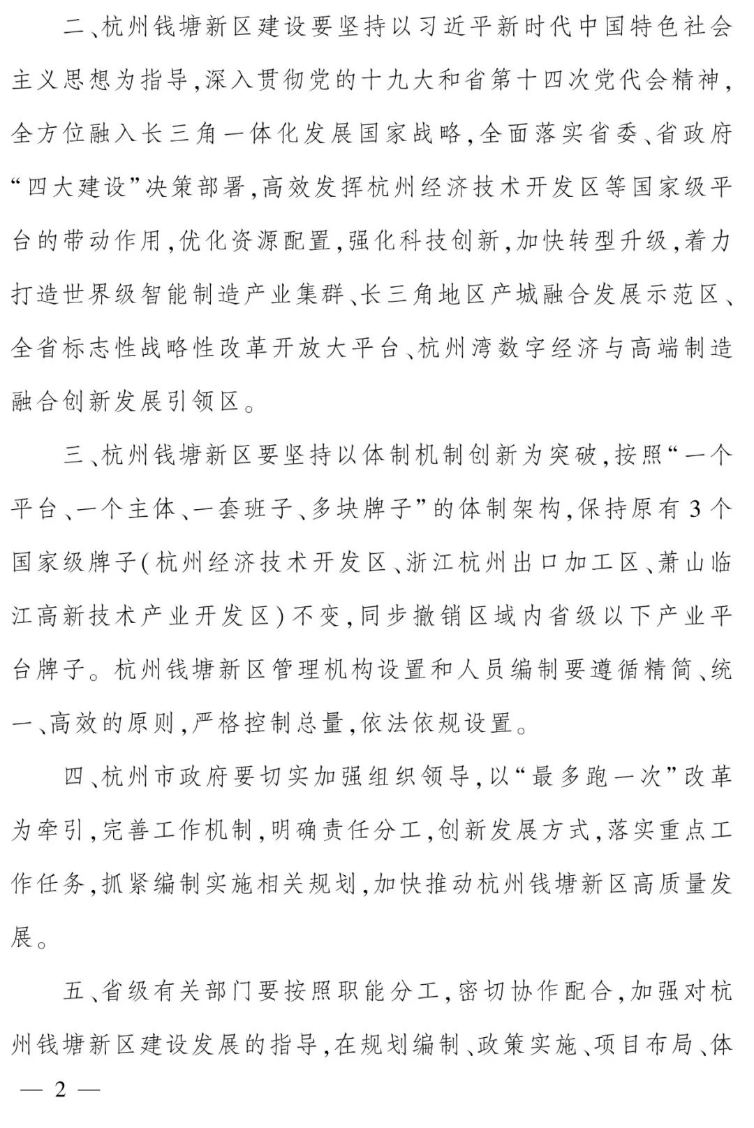 三、杭州钱塘新区要坚持以体制机制创新为突破,按照“一个平台、一个主体、一套班子、多块牌子”的体制架构,保持原有3个国家级牌子(杭州经济技术开发区、浙江杭州出口加工区、萧山临江高新技术产业开发区)不变,同步撤销区域内省级以下产业平台牌子。杭州钱塘新区管理机构设置和人员编制要遵循精简、统一、高效的原则,严格控制总量,依法依规设置。