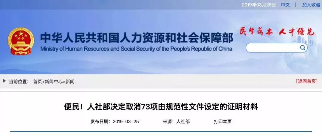 人社部近日公布决定,取消73项由规范性文件设定的证明材料,包括申报职业技能鉴定的身份证明、结业证书、职业资格证书;办理工伤登记的居民身份证原件及复印件、认定工伤决定书;劳动能力鉴定登记时的劳动能力鉴定结论书,等等。
