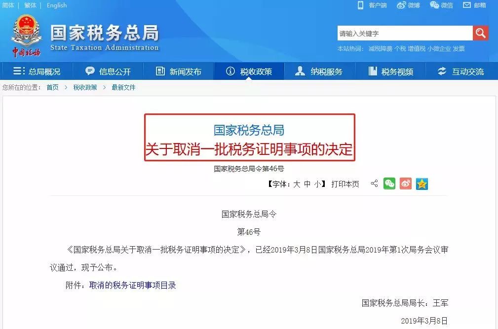 《国家税务总局关于取消一批税务证明事项的决定》:已经2019年3月8日国家税务总局2019年第1次局务会议审议通过,现予公布。国家税务总局关于取消一批税务证明事项的决定