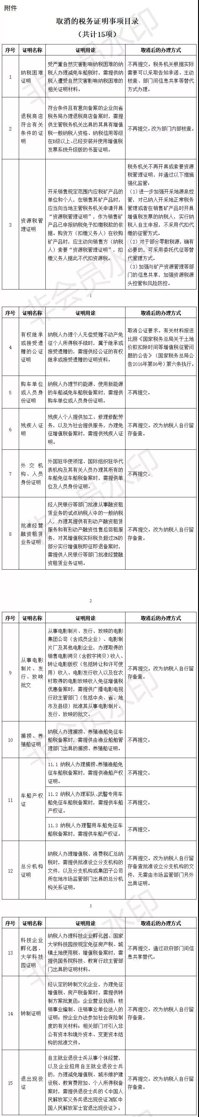 为贯彻落实党中央、国务院关于减税降费和减证便民决策部署,税务总局决定再取消12项(附件所列1—12项)税务证明事项,自公布之日起施行。所涉及的规章、规范性文件,按程序修改后另行公布。