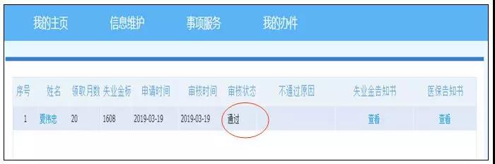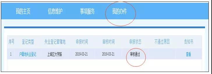 您可以到“我的办件”查询申报状态、失业登记管辖地等信息。经审核符合失业登记条件的,申报状态显示为“审核通过”。