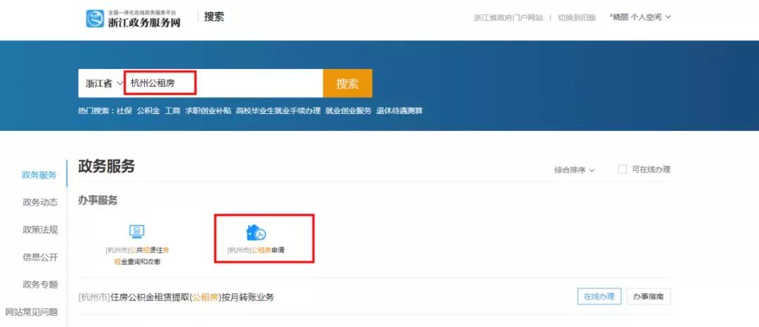 步骤二:搜索杭州公租房,点击"公租房申请"。