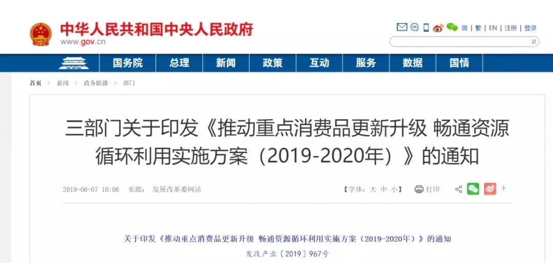 推动重点消费品更新升级 畅通资源循环利用实施方案(2019-2020 年)