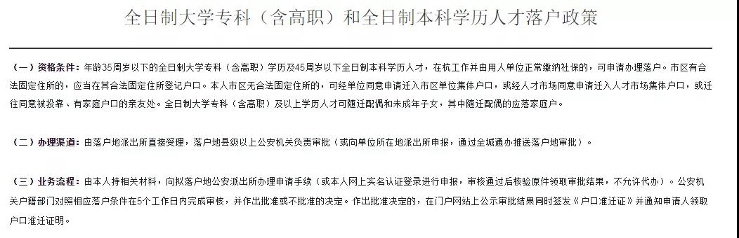 全日制大专、本科学历,专科35周岁以下,本科45周岁以下,在杭工作,社保缴纳1月以上且已到账,便可在杭州落户。