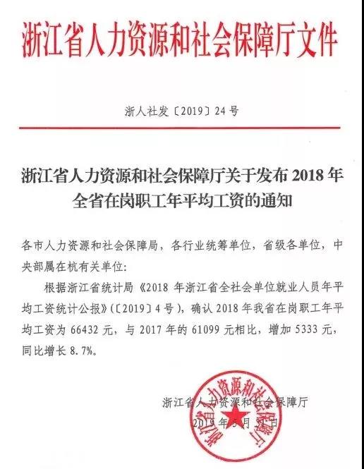 近日,浙江省人社厅根据浙江省统计局《2018年浙江省全社会单位就业人员年平均工资统计公报》(〔2019〕4号),确认2018年我省在岗职工年平均工资为66432元。
