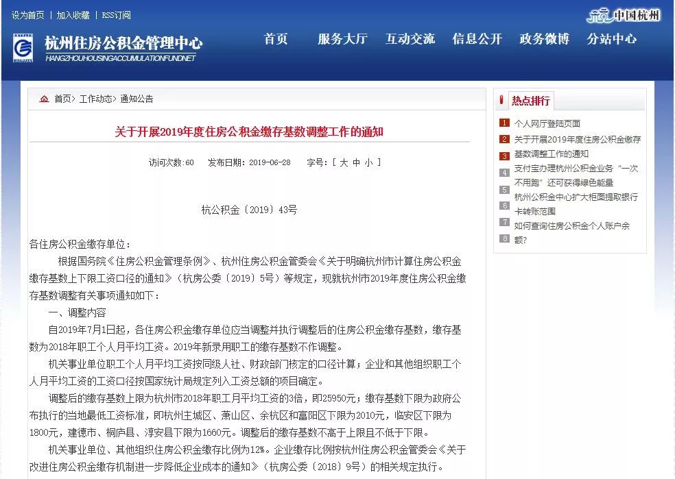 调整依据:调整后的缴存基数上限为杭州市2018年职工月平均工资的3倍,即25950元(2018年度全市在岗职工月平均工资8650元*3倍);缴存基数下限为政府公布的当地最低工资标准。