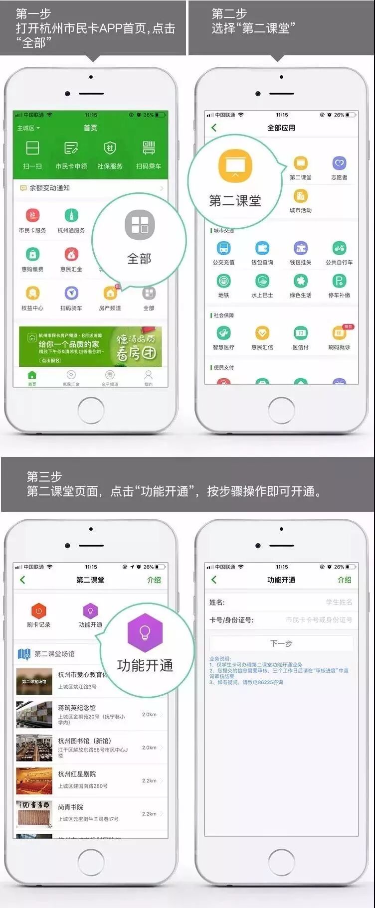 作为第一课堂的衍生和补充,各个学校将会对孩子第二课堂的使用情况进行考核。所以办理好学生市民卡后也别忘记在手机上开通学生市民卡的“第二课堂”功能哦。只需进入杭州市民卡APP,点击“第二课堂”进行“功能开通”,根据提示完成操作即可。