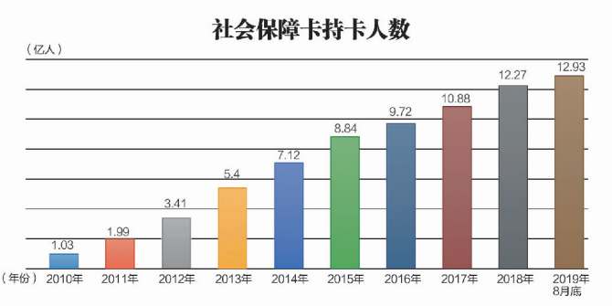 1999年12月,全国第一张社保卡在上海首发,经过20年的发展,2019年8月,全国社保卡持卡人数已达12.93亿人,覆盖我国92%以上人口,提前完成“十三五”规划任务。